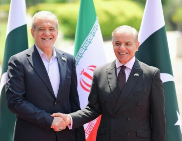 وزیر اعظم شہباز شریف نے کہا ہے کہ پاکستان پر امن مقاصد کے لیے ایران کے جوہری پروگرام کی حمایت کرتا ہے اور اس کے حق کے لیے اس کے ساتھ کھڑا ہے۔وزیر اعظم نے یہ بات ایران کے صدر ڈاکٹر مسعود پزشکیان کے ہمراہ وزیر اعظم آفس میں مشترکہ نیوز کانفرنس سے خطاب کرتے ہوئے کہی۔شہباز شریف نے کہا کہ ایرانی صدر کو پاکستان میں خوش آمدید کہتے ہیں، شہباز شریف کا کہنا تھا مسعود پزشکیان بطورایرانی صدر پہلی مرتبہ پاکستان کےدورے پر آئے ہیں، ان کے ساتھ باہمی روابط، تعلقات، بھائی چارے، مذہبی اور جغرافیائی امور سمیت دیگر معاملات پر سیر حاصل گفتگو ہوئی۔شہباز شریف کا کہنا تھا جون میں اسرائیل نے بغیر کسی وجہ کے ایران کے خلاف جارحیت کی، پاکستان اور یہاں کے عوام نے ایران پر اسرائیلی حملے کی مذمت کی۔وزیر اعظم کا کہنا تھا آج ایران کے ساتھ کئی ایم او یوز پر دستخط ہوئے ہیں، خواہش ہے بہت جلد یہ معاہدوں کی شکل اختیار کریں، ایران اور پاکستان نے 10 ارب ڈالرز کی تجارت کا ہدف مقرر کیا ہے۔انہوں نے کہا کہ ایران کو پُرامن مقاصد کیلئے جوہری طاقت حاصل کرنے کا پورا حق ہے، پاکستان پرامن مقاصد کے لیے جوہری توانائی کے حصول کے ایرانی مؤقف کے ساتھ کھڑا ہے، اچھے وقت میں سب دوست ہوتے ہیں، اصل دوست وہ ہوتا ہے جوبرے وقت میں ہاتھ تھامے۔قبل ازیں اسلامی جمہوریہ ایران کے صدر مسعود پزشکیان کی وزیراعظم ہاؤس آمد پر وزیراعظم شہباز شریف نے ان کا پرتپاک خیر مقدم کیا، ایرانی صدر کے اعزاز میں پروقار استقبالیہ تقریب منعقد کی گئی۔وزیراعظم ہائوس آمد پر ایرانی صدر کا وزیراعظم نے پرتپاک استقبال کیا، دونوں رہنماؤں نے گرمجوشی سے مصافحہ کیا اور خیر سگالی کلمات کا تبادلہ کیا جس کے بعد فوٹو سیشن ہوا۔استقبالیہ تقریب کے آغاز پر دونوں ممالک کے قومی ترانے بجائے گئے اور مسلح افواج کے چاک وچوبند دستوں نے معزز مہمان کو گارڈ آف آنر پیش کیا۔وزیراعظم نے ایران کے صدر کا نائب وزیراعظم و وزیر خارجہ سینیٹر محمد اسحاق ڈار، وزیر دفاع خواجہ محمد آصف، وفاقی وزیر قومی غذائی تحفظ و تحقیق رانا تنویر حسین، وزیر مواصلات عبدالعلیم خان، وزیر ہائوسنگ ریاض حسین پیرزادہ، وزیر ریلوے محمد حنیف عباسی سے تعارف کرایا۔اس موقع پر شہباز شریف نے وزیر تجارت جام کمال خان، وزیر اطلاعات ونشریات عطا اللہ تارڑ سمیت وفاقی کابینہ کے اراکین احمد چیمہ، علی پرویز ملک، ہارون اختر خان، طارق فاطمی سمیت اعلیٰ حکام سے بھی تعارف کروایابعد ازاں ایران کے صدر نے وزیراعظم محمد شہباز شریف سے اپنے کابینہ اراکین کا تعارف کرایا۔ڈاکٹر مسعود پزشکیان نے وزیراعظم ہائوس کے سبزہ زار میں یادگاری پودا بھی لگایا۔اس موقع پر عالم اسلام کی ترقی و خوشحالی کے لئے خصوصی دعا کی گئی۔وزیراعظم محمد شہباز شریف اور ایرانی صدر وفود کی سطح پر ملاقات ہوئی اور دونوں ممالک کے باہمی روابط کے فروغ اور علاقائی صورتحال پر تبادلہ خیال کیا گیا۔