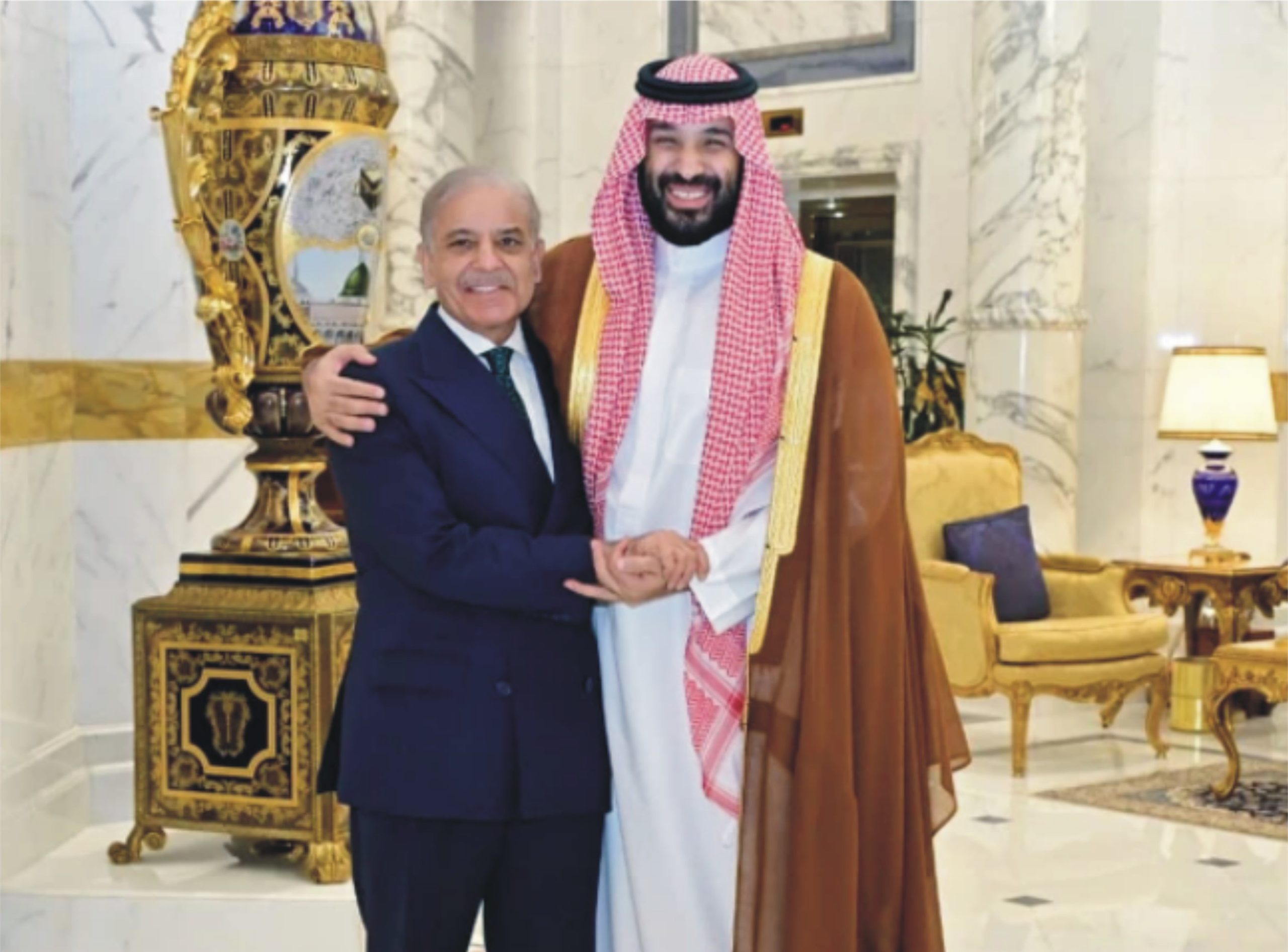 ریاض:وزیر اعظم پاکستان شہباز شریف اور سعودی ولی عہد محمد بن سلمان کے درمیان ہونے والی اہم ملاقات کا اعلامیہ جاری کر دیا گیا ہے، جو سعودی خبر رساں ادارے ایس پی اے نے جاری کیا۔اعلامیے کے مطابق ملاقات میں پاک سعودی تعلقات سمیت مختلف شعبوں میں دو طرفہ تعاون کا تفصیلی جائزہ لیا گیا جبکہ دونوں رہنماؤں نے باہمی شراکت داری کو مزید فروغ دینے پر اتفاق کیا۔سعودی ولی عہد نے پاک سعودی اسٹرٹیجک تعاون کو سراہتے ہوئے اسے مزید مستحکم بنانے کے لیے وزیراعظم شہباز شریف کی کاوشوں کی تعریف کی۔ ملاقات کے دوران مشرق وسطیٰ کی مجموعی صورتحال پر بھی تبادلہ خیال کیا گیا۔اعلامیے میں بتایا گیا ہے کہ امریکہ اور ایران کے درمیان جاری سفارتی کوششوں پر بھی گفتگو ہوئی جبکہ خطے میں امن کے قیام کے حوالے سے اقدامات زیر بحث آئے۔اس موقع پر سعودی ولی عہد نے وزیراعظم شہباز شریف اور سید عاصم منیر کے کردار کو سراہتے ہوئے کہا کہ سعودی عرب خطے میں امن و استحکام کے لیے ہر ممکن تعاون جاری رکھے گا۔